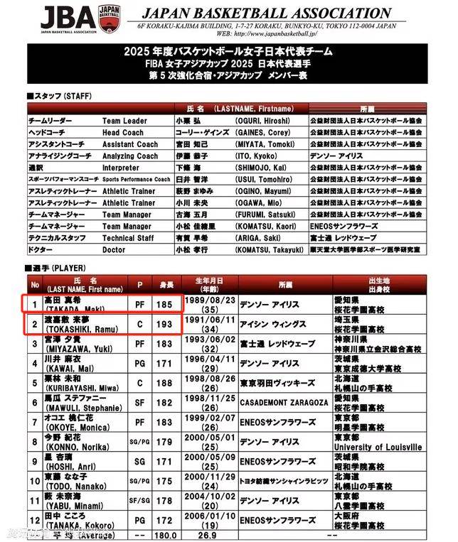 日本女篮:通过她们的12人大名单可以看出,日本女篮近期进行了针对性补强,除了保持原有的 “矮快灵” 阵容,又新增了渡嘉敷来梦(1.93 米)、马瓜 - 斯蒂芬妮(归化球员)等 4 名前场球员,将球队的平均身高提升至 1.80 米,这个记录也创下了日本队近两个奥运周期的新高。